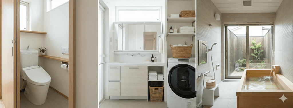 The toilet is treated as a precise, enclosed space dedicated to a single function. The washroom supports transitional hygiene, like handwashing and grooming. The bathing area is reserved for full-body cleansing and relaxation, often used daily as part of routine maintenance rather than occasional indulgence. This layout is commonly explained in guides to Japanese domestic design, including overviews published by FUN! JAPAN.